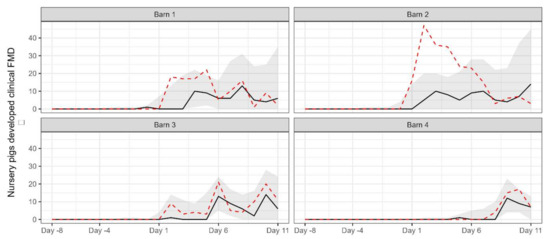 The median (black solid line) and 95% prediction interval (grey area) of the simulated number of pigs removed due to the development of clinical signs for each barn. The red dashed line indicates the observed number of removed pigs.