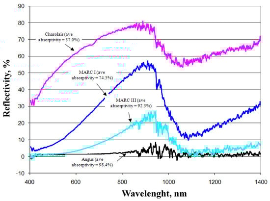 Transmissivity is the fraction of irradiation transmitted through the haircoat toward the skin surface, reflectivity is the fraction of incident energy reflected back from the haircoat and skin surface together, and absorptivity is the fraction of irradiation absorbed by the haircoat. Many investigators [7,11,14] have measured spectral properties of haircoats. The properties of interest are transmissivity, reflectivity, and absorptivity. Gebremedhin et al. [11] measured reflectivity and transmissivity, and using Equation (2), calculated the absorptivity of the haircoat of four breeds of heifers. The results are shown in Figure 1 and Figure 3. The average absorptivity values are given in Table 2, and the percent reflectivity expressed as a function of wavelength is shown in Figure 4. Hillman et al. [21] measured the absorptivity of black and white hair of lactating Holstein cows. The data are given in Table 2. They used a pyrometer to measure the incident and reflected short-wave radiation.