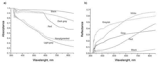Optical properties of heifers of different hair color (a) absorptivity and (b) reflectivity as a function of wavelength [14].