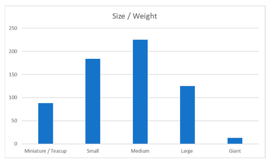 As shown in Figure 2, most dogs were medium-sized dogs (10–25 kg bodyweight) or small dogs (5–10 kg). Moreover, 19.7% were large dogs (25–40 kg), 13.9% were miniature dogs (under 5 kg), and only 2% were giant breed dogs (over 40 kg).
