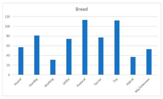 A total of 58.6% were purebred dogs, with the most common breed groups (according to the seven UK Kennel Club breed groups) being pastoral—also known as working- or herding breeds—(17.8%) and toy (17.6%) breeds (see Figure 3). Hybrid breeds are defined in this survey as modern designer breed dogs such as Labradoodles and Cockapoos and made up 5.8% of dogs in this study. Moreover, 8.3% (53 dogs) were brachycephalic breed dogs.