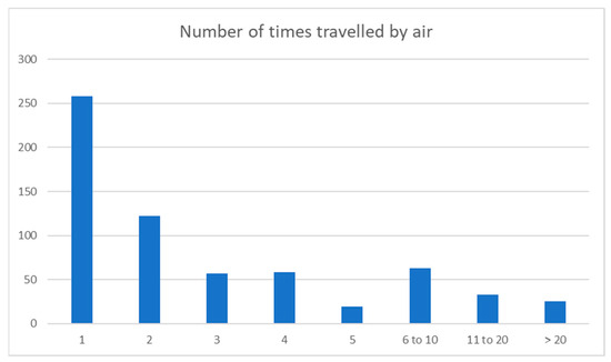 Almost 60% of dogs in this survey had travelled by air once or twice. Canine air travel can be complex to organise, financially expensive, and, according to this survey, is either extremely or very stressful for over 40% of pet owners and these may be some of the reasons for the infrequency of air travel for most dogs in this study. Under 10% of dogs were frequent flyers with over 10 air travel events. Further exploration of the data are necessary to find correlations and will be part of a future paper.