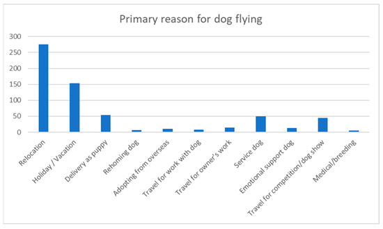 The primary reason for dogs travelling by air in this survey was relocation (43.5%). This was followed by taking the dog on vacation (24.3%). Moreover, 8.5% of participants received their dog via air transportation as puppies, 7.9% of dogs travelled as service dogs, and 6.9% of dogs travelled to dog shows or competitions (see Figure 6).
