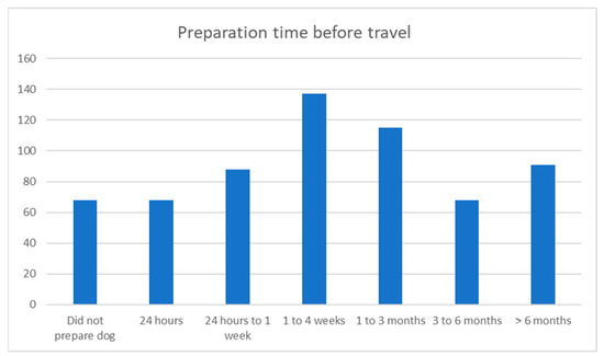 Most participants (21.6%) started preparing their dogs for air travel 1–4 weeks before the travel date, with the second largest group (18.1%) beginning preparation 1–3 months before travel. A smaller number of owners started preparing more than 6 months before travel (14.3%), and surprisingly, 13.9% only started preparing their dogs 24 h to 1 week before travel. Around 10% each started 3–6 months before travel, 1 day before travel, or did not prepare their dogs for travel themselves (see Figure 7).