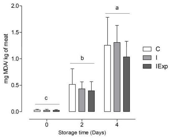 Lipid oxidation, evaluated in cooked LL samples stored for 0, 2, and 4 days after cooking, showed a significant increase with longer storage duration. However, within each storage period, there were no significant differences observed in lipid oxidation between the samples from C, I, and IExp pigs (Figure 1).