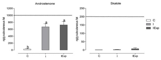 Androstenone and skatole content of neck subcutaneous fat from castrated (C), intact (I) and intact experimental (IExp) Alentejano pigs slaughtered at ~160 kg LW []. (n = 10 per group;