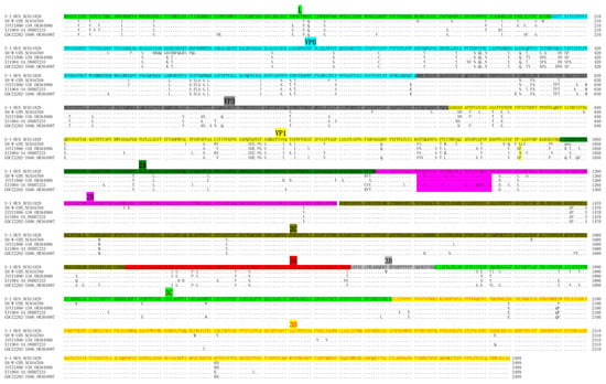 | Polyprotein | 7380/7470/7380 | 87.69/94.58 | 88.18/94.94 | 88.05/94.42 | 87.93/95.70 | 87.90/95.14 | 90.93/97.97 |