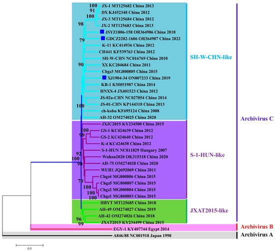 - Li, Y.; Liang, J.; Wu, S.; Yan, Z.; Zhang, W. Complete genomic sequence analysis and intestinal tissue localization of a porcine Kobuvirus variant in China. Infect. Genet. Evol. 2022, 104, 105362. [Google Scholar] [CrossRef] [PubMed]
