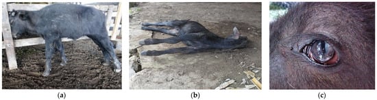 Considering the most frequent diseases, rabies was ruled out by epidemiological data (as the disease only affects young buffalo calves) and by histopathological findings such as the absence of the Negri corpuscle in the CNS tissue and the presence of CNS gray matter necrosis, which is not correlated with rabies []. Likewise, botulism was also ruled out by epidemiology, as this intoxication is not common in suckling calves and the typical clinical signs (e.g., flaccid paralysis) were not observed in the studied buffaloes [].
