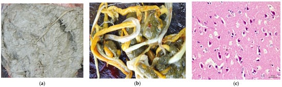 At necropsy, there is encephalic edema, pallor, and softening of the cerebral hemispheres and flattening of the cerebral gyri, with herniation of the cerebellum through the foramen magnum and extensive gray matter malacia areas [,,]. The diagnosis of PEM is based on epidemiological, clinical–pathological, and histopathological findings and, in some cases, on the clinical response to thiamine and corticoid treatment [].
