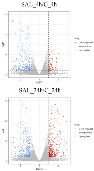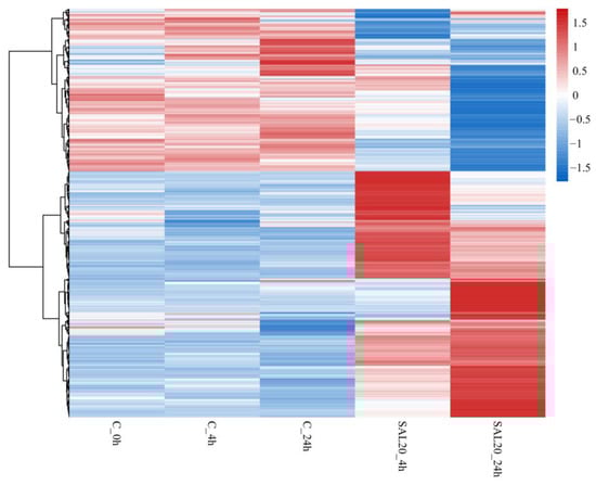 The clustering heat map reflected the overall expression of the sample. The results showed that the expression profiles of the three control groups were essentially the same (C_0h, C_4h, and C_24h). The expression patterns of the two experimental groups (SAL20_4h and SAL20_24h) showed significant differences compared with the control group with the same exposure time (Figure 2).
