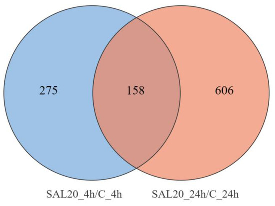 The Venn plot showed that 764 genes were significantly differentially expressed at 24 h of exposure time, and 433 genes were significantly differentially expressed at 4 h of exposure time. There were 158 DEGs that showed significant differential expression at both 4 and 24 h (Figure 3).