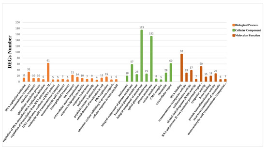DEGs were enriched in three categories in the GO: biological processes, cellular components, and molecular functions. The top 20 terms for biological processes and cellular components and the top 10 terms for molecular functions were selected (p ≤ 0.01) (Figure 4). In the first 20 terms of biological processes, processes such as “transmembrane transport” and “ion transport” were related to the transfer and transport of substances.