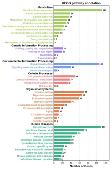 - Love, M.I.; Huber, W.; Anders, S. Moderated estimation of fold change and dispersion for RNA-seq data with DESeq2. Genome Biol. 2014, 15, 550. [Google Scholar] [CrossRef]