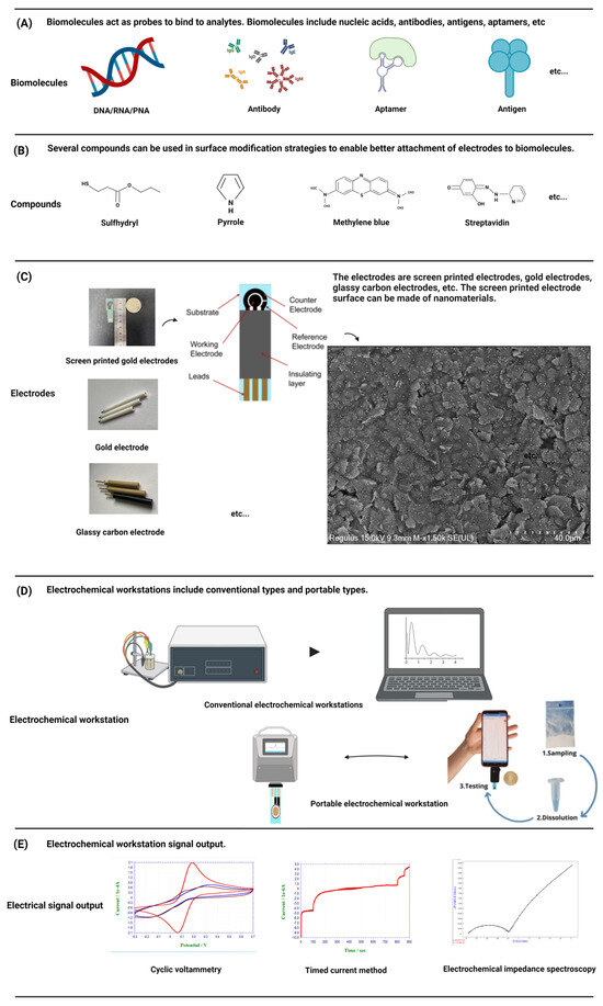 - Banakar, M.; Hamidi, M.; Khurshid, Z.; Zafar, M.S.; Sapkota, J.; Azizian, R.; Rokaya, D. Electrochemical biosensors for pathogen detection: An updated review. Biosensors 2022, 12, 927. [Google Scholar]