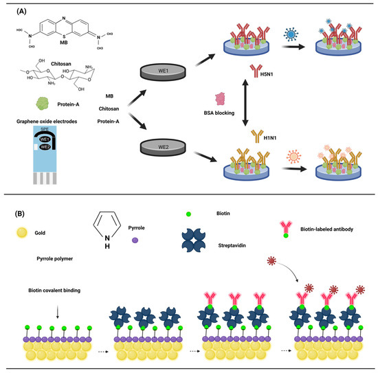 - Veerapandian, M.; Hunter, R.; Neethirajan, S. Dual immunosensor based on methylene blue-electroadsorbed graphene oxide for rapid detection of the influenza a virus antigen. Talanta 2016, 155, 250–257. [Google Scholar] [CrossRef] [PubMed]