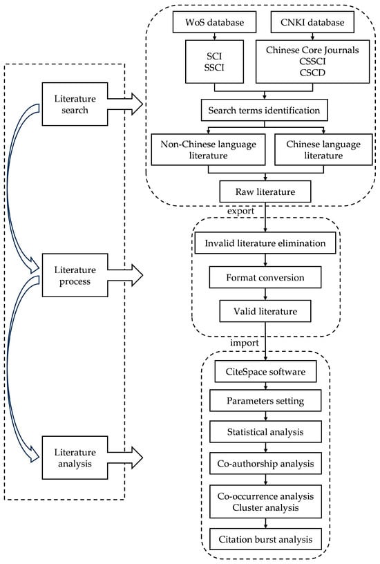 Bibliometric analysis is a widely used research method that can reveal the research status of a specific academic field by dealing with and analyzing published research papers using mathematical and statistical methods [29]. With the rapid development of computational and information visualization technologies, scientific knowledge mapping has become a practical bibliometric method [30]. However, there is no consensus on which bibliographic software is best [31]. CiteSpace, a Java-based data visualization analysis software developed by Professor Chen Chaomei and his team, can effectively recognize Chinese characters and thus avoid errors or unintelligible codes [21,32]. Therefore, CiteSpace (version 6.2.R2) was used to perform bibliometric analysis and create scientific knowledge maps in the present study.