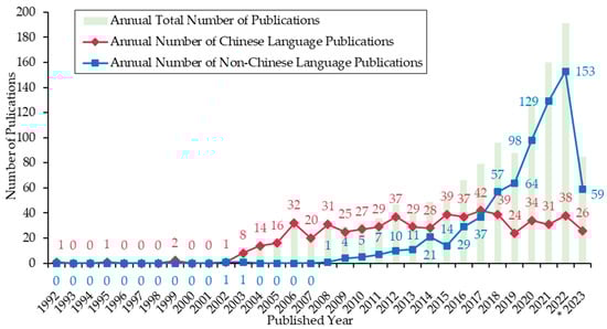 A total of 5048 publication records met the search criteria, which were obtained from the WoS and CNKI databases, comprising 2128 non-Chinese-language publication records and 2920 Chinese-language publication records, respectively. After removing all ineligible papers based on the exclusion criteria, a total of 1312 Chinese farm animal welfare articles published between March 1992 and June 2023 were included and used in the final analysis and visualization, including 701 non-Chinese-language articles (from October 2002 to June 2023) and 611 Chinese-language articles (from March 1992 to June 2023). Notably, all of these 701 non-Chinese-language articles were published in English, suggesting that English is the dominant language for Chinese farm animal welfare research published in international journals.