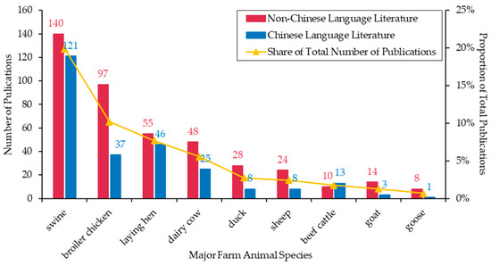 As shown in Figure 3, the main species of interest for Chinese farm animal welfare research, ranked in descending order of priority, were swine (n = 261, 19.89%), chickens (n = 235, 17.91%), cattle (n = 96, 7.32%), sheep (n = 49, 3.73%), ducks (n = 36, 2.74%), and geese (n = 9, 0.69%). Swine are the primary focus in Chinese-language literature (n = 121, 19.80%) and the second focus in non-Chinese-language literature (n = 140, 19.97%), highlighting the important role of swine as farm animals in China. Chickens are the most commonly reported species in non-Chinese-language literature (n = 152, 21.68%) and the second most commonly reported species in Chinese-language literature (n = 83, 13.58%). There is subtle variation in the specific chicken species of interest between the non-Chinese- and Chinese-language literature. More than 60% of the non-Chinese-language literature related to chickens focused on broiler chickens (n = 97, 63.82%), while more than half of the Chinese-language literature related to chickens used laying hens (n = 46, 55.42%) as the specific species. Regarding cattle, both the non-Chinese- and Chinese-language literature demonstrate a preference for using dairy cows (n = 73, 5.56%) as research subjects, rather than beef cattle (n = 23, 1.75%). Both the non-Chinese- and Chinese-language literature exhibit a greater focus on sheep (n = 32, 2.44%) than goats (n = 17, 1.30%). Although ducks and geese received relatively little attention among poultry species, the non-Chinese-language literature showed considerably more interest in these two species than the Chinese-language literature, with nearly four times as many non-Chinese-language publications (n = 36, 5.14%) focusing on these species than in the Chinese-language literature (n = 9, 1.47%). Limited attention has been given to the welfare of other farm animal species in China, such as rabbits (n = 11, 0.84%), horses (n = 4, 0.30%), and donkeys (n = 4, 0.30%).