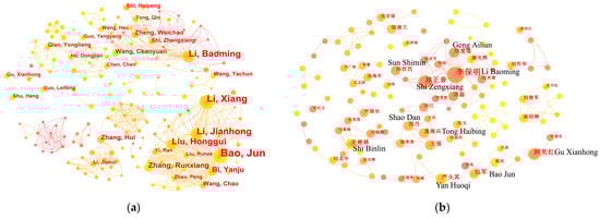 Author collaboration network map of the field of farm animal welfare in China. (a) Author collaboration network map of the non-Chinese-language literature; (b) author collaboration network map of the Chinese-language literature.