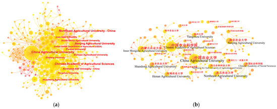 Institution collaboration network map of the field of farm animal welfare in China. (a) Institution collaboration network map of the non-Chinese-language literature; (b) Institution collaboration network map of the Chinese-language literature.