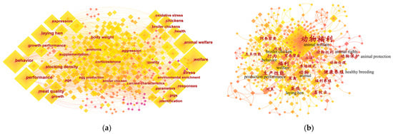 A keyword co-occurrence map of the non-Chinese-language literature (Figure 6a) and Chinese-language literature (Figure 6b) was obtained through keyword co-occurrence analysis using CiteSpace. High-occurring keywords consist of specific species and specific research topics, reflecting popular species and research hotspots in the field of farm animal welfare in China to an extent. In the non-Chinese-language literature, “welfare” is the keyword with the highest occurrence, followed by “behavior”, “performance”, “animal welfare”, and “growth performance”. In the Chinese-language literature, “animal welfare” is the keyword with the highest occurrence, followed by “welfare”, “laying hen”, “healthy breeding”, and “behavior”. Figure 6 illustrates that the keywords with high occurrence in both the non-Chinese- and Chinese-language literature share similarities in terms of species and research topics, such as “laying hen”, “welfare”, “behavior”, and “animal welfare”, indicating that there are common research hotspots in both the non-Chinese- and Chinese-language literature on farm animal welfare research in China.