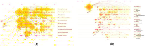 The keywords were analyzed by cluster analysis using CiteSpace, which grouped keywords from the non-Chinese-language literature (Figure 7a) and Chinese-language literature (Figure 7b) into 9 and 12 clustering labels, respectively. The sequence number of clustering labels was inversely proportional to the size of the clusters. In the non-Chinese-language literature, the largest cluster was labeled as “#0 deep learning”, followed by “#1 stereotypic behavior”, “#2 heat stress”, “#3 quantitative trait loci”, “#4 animal welfare”, “#5 carcass yield”, “#6 meat quality”, “#7 tibial dyschondroplasia”, “#8 stocking density”, and “#9 piglet welfare”. In the Chinese-language literature, the largest cluster was labeled as “#0 animal welfare”, followed by “#1 laying hen”, “#2 behavior”, “#3 production performance”, “#4 animal”, “#5 animal protection”, “#6 animal husbandry”, “#7 pork”, “#8 swine welfare”, “#9 international trade”, “#10 animal rights”, “#11 environmental control”, and “#12 food safety”.