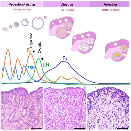 Hormonal profile in the ovulatory cycle of the domestic cat. In the domestic cat’s estrous cycle, E2 levels increase gradually, concomitantly with high FSH levels, and reach the highest values at the beginning of the estrus phase. In the proestrus/estrus phase, concomitant with the growth of ovarian follicles, the uterus has numerous growing glands and prominent vascularity (lower left panel). Usually, after copulation, there is an increase in the concentration of LH, leading to ovulation. In other cases, without ovulation, cats go through an interestrus phase and return to the proestrus phase. With ovulation, the LH surge leads to the formation of the corpus luteum, which initiates P4 production. In the diestrus phase, the uterus (lower central panel) presents endometrial glands in secretory activity. P4 levels fall progressively towards the end of the luteal phase. The anestrus phase is characterized by a low hormonal profile, which shows a phase of reproductive quiescence (bottom right panel). Legends: E2 = estradiol; P4 = progesterone. Staining: Hematoxylin and Eosin. Bar: 50 µm.