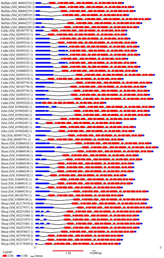 Transcriptional region structure of ABCG2 in some Bovidae species. The coding region of the buffalo ABCG2 gene obtained in this study belongs to the transcript type with 15 exons in the coding region.