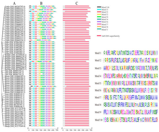Phylogenetic relationships, motifs, and conserved domains of ABCG2 in Bovidae species. (A) Phylogenetic tree; (B) motif pattern; (C) conserved domain. The conserved motifs and domains in ABCG2 are marked with different color boxes.