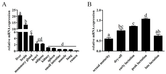 Five lactating Binglangjiang buffaloes (peak lactation, five years old, about 60 d postpartum) were slaughtered, and tissue samples of the heart, liver, kidney (medulla), lung, mammary gland, adipose tissue, muscle, rumen, small intestine, spleen, and brain (cortex) were promptly collected and flash-frozen in liquid nitrogen. In addition, mammary gland tissue samples were surgically obtained from five Binglangjiang buffaloes at sexual maturity (two years old) and five Binglangjiang buffaloes (five years old) that underwent four different physiological states: early lactation (approximately 20 days postpartum), peak lactation (approximately 60 days postpartum), late lactation (approximately 220 days postpartum), and dry-off period (approximately 60 days before parturition) following previously described methods [19]. RNA extraction was performed utilizing RNAiso Plus (TaKaRa, Dalian, China), and the cDNA synthesis was carried out utilizing the PrimeScript RT kit (TaKaRa, Dalian, China) with 2 µg RNA for each sample.