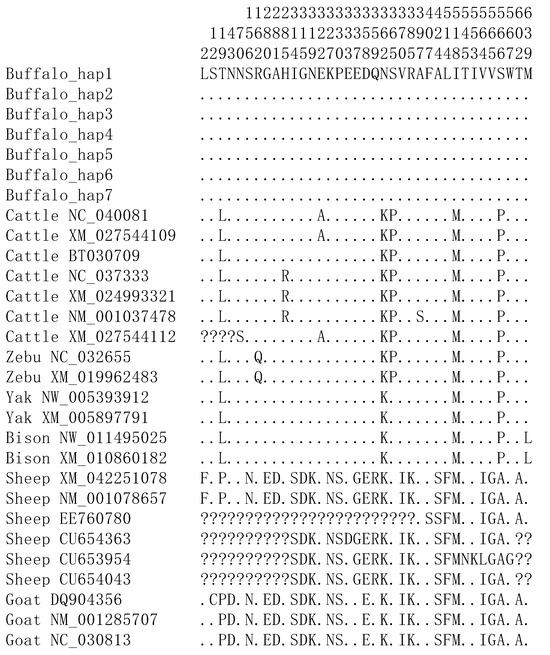 Differences in amino acid sequences corresponding to the ABCG2 haplotypes in some species of Bovidae. Number represents the position of coding region. Dots (.) denote identity with Buffalo_hap1. Amino acid substitutions are denoted by different letters. Missing information is denoted by a question mark (?).