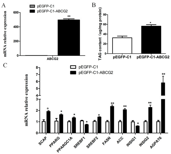 Effects of ABCG2 overexpression on the genes related to milk fat synthesis and TAG content in BuMECs. (A) The expression of ABCG2 in BuMECs after transfection of pEGFP-C1 or pEGFP-C1-ABCG2, respectively. (B) The change in TAG content in BuMECs after ABCG2 overexpression. (C) The expression of genes related to milk fat synthesis after ABCG2 overexpression. The results are presented as mean ± SEM from n = 3 independent cultures. * p < 0.05; ** p < 0.01.