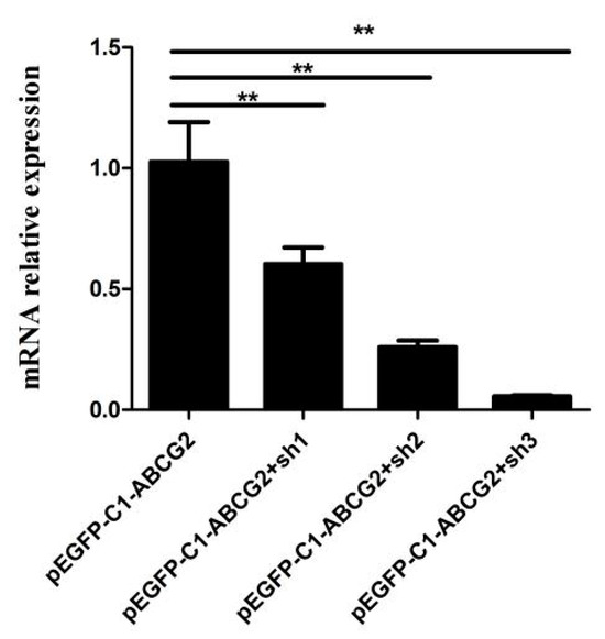 Interference efficiency of three shRNAs for ABCG2 evaluated via qPCR. The results are presented as mean ± SEM from n = 3 independent cultures; ** p < 0.01.