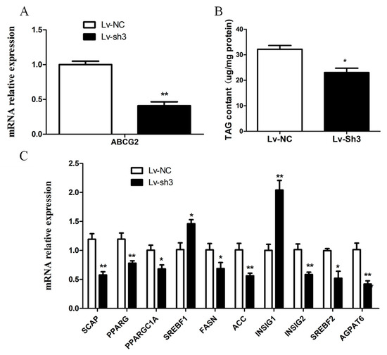 Effects of the ABCG2 knockdown on the genes related to milk fat synthesis and TAG content in BuMECs. (A) The expression of ABCG2 in BuMECs after being treated with Lv-sh3. (B) The change in TAG content in BuMECs after ABCG2 knockdown. (C) The expression of genes related to milk fat synthesis in BuMECs after ABCG2 knockdown. The results are presented as mean ± SEM from n = 3 independent cultures. * p < 0.05; ** p < 0.01.