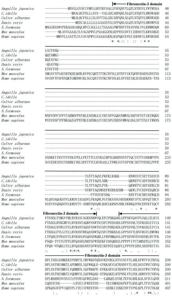 Multiple comparisons of IFNAR1 amino acid sequences of Japanese eel AjCRFB5a of other species. Structural domains are indicated by arrows, identical amino acid residues are denoted by “*”; similar amino acid residues are denoted by “: or .” for similar amino acid residues.