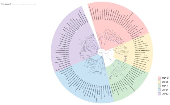- Chen, H.; Liu, W.; Wang, B.; Mao, H.; Sun, Z.; Hou, Q.; Mi, Y.; Fan, L.; Hu, C. Cloning, identification of the two cytokine receptor family B subunits CRFB1 and CRFB5 from grass carp (Ctenopharyngodon idella). Fish Shellfish Immunol. 2015, 45, 211–220. [Google Scholar] [CrossRef]