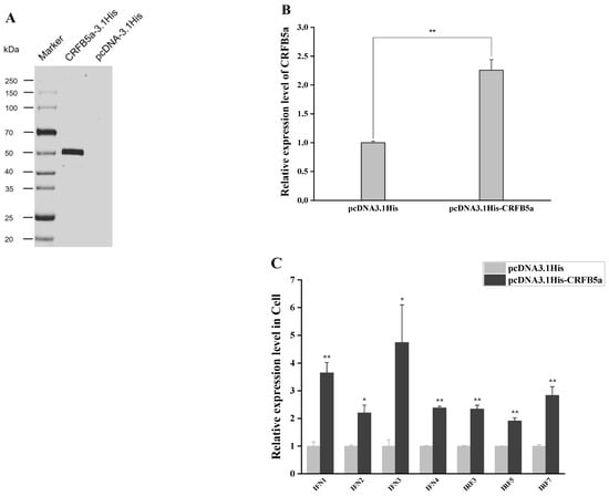 The molecular weight of AjCRFB5a was calculated to be 47.24 kDa by the Novopro online tool, and Western blot analysis using Anti-His antibody showed that the molecular weight of the pcDNA3.1His-AjCRFB5a fusion protein was close to 50 kDa (Figure 10A). The expression profiles of AjCRFB5a and immune-related genes under overexpression of AjCRFB5a in Japanese eel liver cells were assayed using RT-qPCR. It was found that CRFB5a was successfully overexpressed in Japanese eel liver cells (Figure 10B). AjCRFB5a overexpression significantly enhanced the expression of immune-related genes in Japanese eel liver cells, including IFN1, IFN2, IFN3, IFN4, IRF3, IRF5, and IRF7 of type I IFN signaling pathway (Figure 10C).