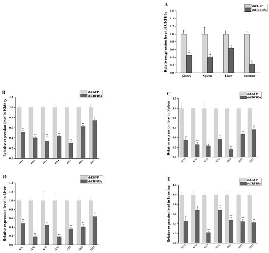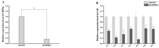 Using RNA interference (RNAi), CRFB5a was silenced. Based on the ORF sequence of CRFB5a, the gene-specific primers with a T7 promoter sequence (Table 1) were designed to amplify a 341 bp fragment using the online program (https://www.flyrnai.org/cgi-bin/RNAi_find_primers.pl, accessed on 5 August 2022). The enhanced green fluorescent protein (EGFP) gene was used as an exogenous control dsRNA (dsEGFP). The detail of dsRNA synthesis referenced our previous studies, as described []. For a short Twelve Japanese eels weighing 20 to 25 g were separated into two groups and given intraperitoneal injections of CRFB5a dsRNA (40 g/individual) and EGFP dsRNA (40 g/individual) for 24 h, respectively, in an RNA interference experiment in vivo. Then, the tissues of the liver, spleen, kidney, and intestine were collected for RNA extraction. For an in vitro short RNA interference experiment, Japanese eel liver cells were cultured as described in our previous study []. The expression levels of CRFB5a, IFN1, IFN3, IFN4, IRF3, IRF5, IRF7, and LEAP2 genes in Japanese eel were detected using RT-qPCR (Table 1).