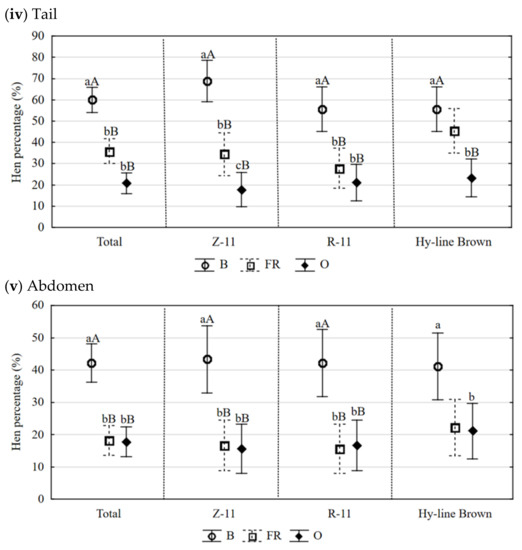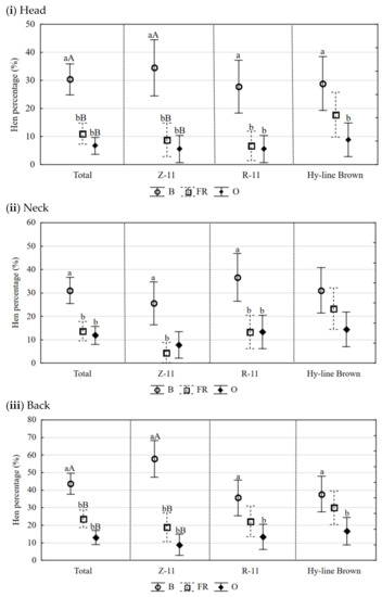 Effect of the type of alternative housing system on the share (%) of hens with feather defects in denoted parts of the body. Explanations: B—barn deep litter system; FR—free-range system; O—organic system; a, b, c—values in columns with various superscripts differ significantly within factors at p < 0.05; A, B —values in columns with various superscripts differ significantly within factors at p < 0.01. Total—for hens Z-11, R-11, and Hy-Line Brown.