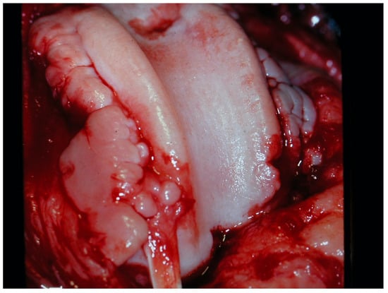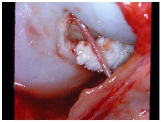 In researching pathogenic mechanisms, most of the reviewed studies focused on the early stages of the joint disease (primary OA). Nevertheless, late and end-stages of CCLD should also be reviewed: secondary OA invariably progresses, especially in untreated cases, accompanied by typical chronic inflammatory changes (osteophytes, cartilage damage) [,]. The severity of degradation largely depends on the cited risk factors: heavy body weight, breed, age, sex, and neuter status. However, independent of these factors, in all dogs with CCLR, the fate of the ruptured ligament is the same: healing and neo-vascularization do not take place, and within 2 to 4 months after ligament rupture, collagen fibrils will have been lysed and absorbed, or reduced to stump-like remnants, lined with a thin inflammatory membrane [,], such as that exemplified in Figure 2.