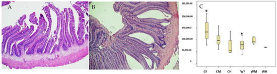 Histological structure the foregut of cultured (A) (H.E., bar = 500 μm) and wild Hemibarbus maculatus (B) (H.E., bar = 500 μm), and the absorption area (C) of gut segments in cultured and wild Hemibarbus maculatus. The width of foregut villus of the cultured was wider than the wild group. The absorption area of the cultured hindgut was larger than the wild group. Note: n = 30, the data were misrepresented by average ± standard deviation, * indicates that the data are significantly dif-ferent from those of cultured (wild) (p < 0.05). CF: Cultured foregut; CM: Cultured midgut; CH: Cultured hindgut; WF: Wild foregut; WM: Wild midgut; WH: Wild hindgut. (means ± SD, n = 10).