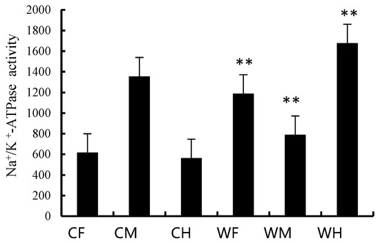 The vitality of Na+/K+-ATPase in cultured and wild Hemibarbus maculatus. The activity of Na+/K+-ATPase in the wild foregut and hindgut was significantly higher than that of the cultured group, while was significantly higher in the midgut of the cultured than that of the wild group. Note: n = 30, the data were misrepresented by average ± standard deviation ** indicates that the data were significantly different from those of cultured (wild) (p < 0.01).