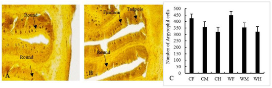 Distribution (A,B) and the number (C) of argyrophil cells in wild (A) and cultured (B) Hemibarbus maculatus. Three types of argyrophil cells were found—fusiform, round and tadpole—and the number of argyrophil cells in foregut was generally higher. Note: n = 30, the data were misrepresented by average ± standard deviation. (Longguikai, bar = 50 μm) Note: n = 30, the data were misrepresented by average ± standard deviation.