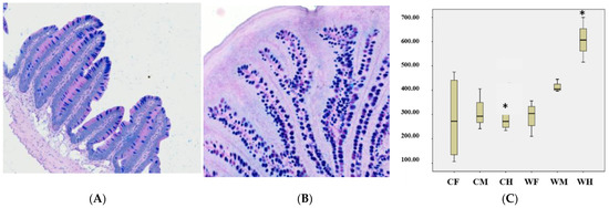 The results showed that the width of foregut villus of the cultured was wider than the wild group (Figure 2A,B and Table 4, p < 0.05). The absorption area of the cultured hindgut was larger than the wild hindgut (Figure 2C, p < 0.01). No significant difference was observed for villus height, crypt depth, intestinal wall thickness and diameter, VH/CD.