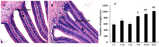 The distribution (A,B) and number (C) of lymphocytes in different gut segments between cultured (A) and wild (B) Hemibarbus maculatus. The number of lymphocytes in the gut tract of the wild group was larger, while the difference between foregut and hindgut was significant, and that in the midgut was very significant. Note: n = 30, the data were misrepresented by average ± standard, * indicates significantly different from those of the cultured (wild) group (p < 0.05), ** indicates significantly different from those of cultured (wild) group (p < 0.01). (H.E., bar = 50 μm).