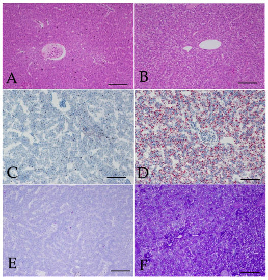 The result showed that in the wild, normal structures were observed (Figure 7A); however, in the cultured fish, rounded vacuole was observed (Figure 7B); they were confirmed by Oil Red O Staining, lipid vacuole degeneration was observed, and many lipid oil droplets were found in the cells but fewer in the wild group (Figure 7C,D). In addition, the area of glycogen deposition was hardly observed in the wild group, while in the cultured group, the deposition of glycogen was present (Figure 7E,F).