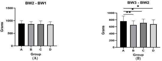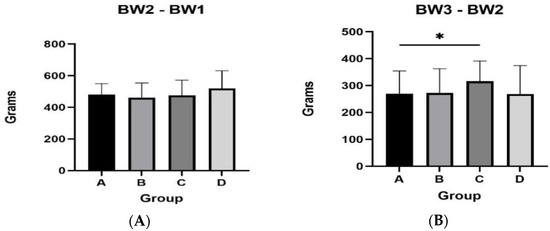 Regarding male mink, during August (BW3 and BW2), group A presented higher body weight gain compared to the rest of the groups (A vs. B, p = 0.006; A vs. C, p = 0.033; A vs. D, p = 0.058) (Figure 3). The same group also presented a tendency for higher body weight gain in September (BW4 and BW3) compared to group C (p = 0.07). However, final body weight was similar between groups (p > 0.05). Body weights of male mink for the total experimental period are presented in Table 3.