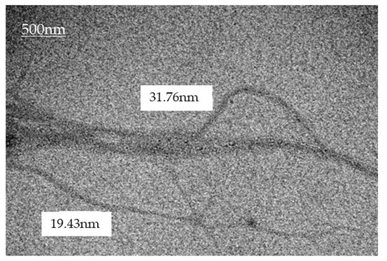 The nanofiber was characterized in terms of their dimensions and chemical characteristics. For the analysis, the sample was submitted to a procedure of individualization of the cellulose fibers. For this process, the sample was diluted in 4 parts of PA ethyl alcohol in eppendordf. This diluted sample was subjected to sonication for 60 min. After this step, the sample was dripped onto a screen covered with Parlodion. Once dried at room temperature, the samples were analyzed using a Transmission Electron Microscope (TEM), brand JEOL, model JEM1200EX-II, located at the Center for Electronic Microscopy (CME) of UFPR. The resulting images were processed with the software Paint.net TM version 3.5.10, which allowed for an estimation of the fibril dimensioning (Figure 1).