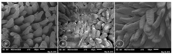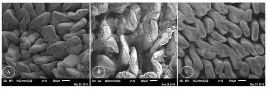 Ultrastructural analysis of the duodenum of rabbits (Figure 2) revealed that the villi appeared flatter and worn plate-like in the Nanosoy-fed animals, and in the form of a tongue, with folds, for the animals in the control group. In all groups, overlapping and folding of the villi in the duodenum was observed. The villi of the jejunum (Figure 3) were thinner and tongue-shaped, with a greater density. However, a greater apical loss of the epithelial lining cells was observed in the villi of Nanosoy-fed animals.